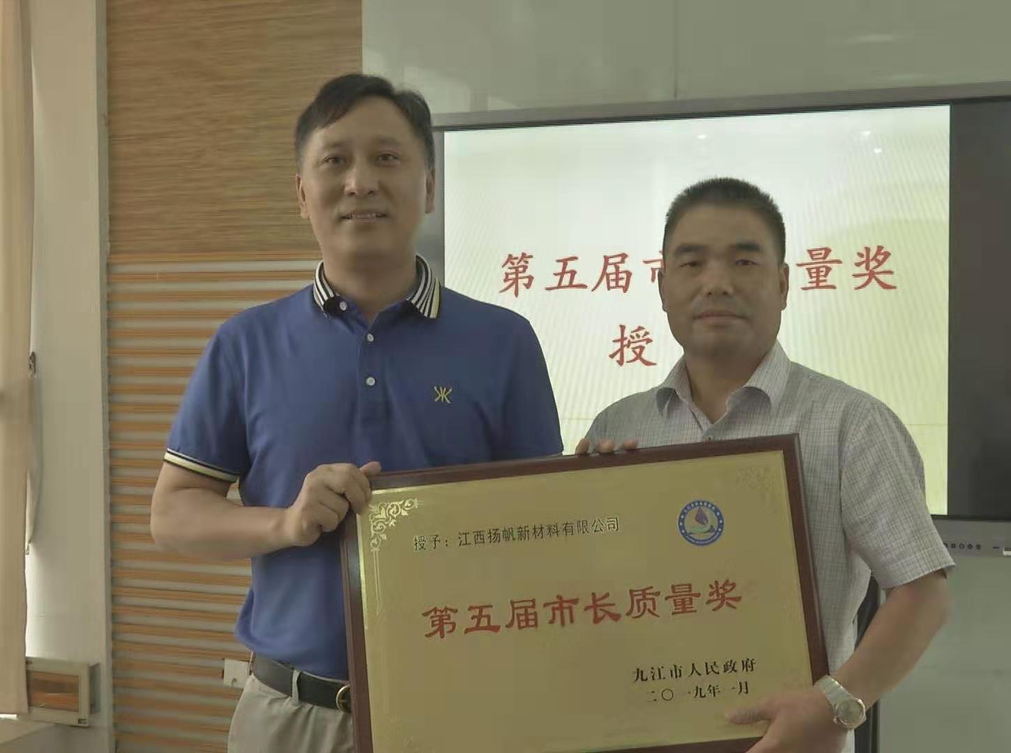 8月26日,九江市、彭澤縣兩級(jí)市場(chǎng)監(jiān)督管理工作人員專程來(lái)到江西揚(yáng)帆,為企業(yè)頒發(fā)2018年第五屆“市長(zhǎng)質(zhì)量獎(jiǎng)”。我公司是2018年度彭澤縣唯一一家“市長(zhǎng)質(zhì)量獎(jiǎng)”獲獎(jiǎng)單位。
