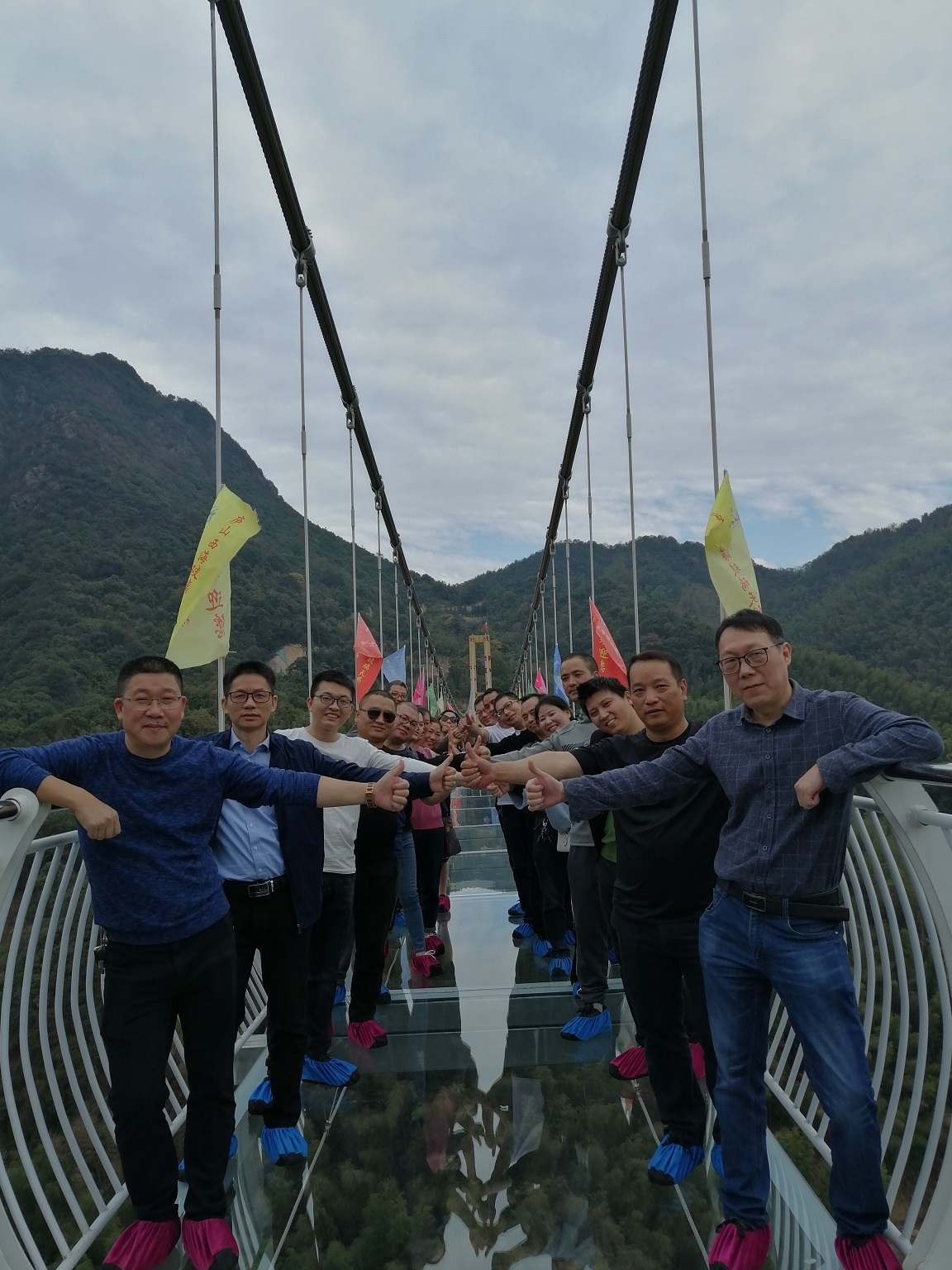 16日一早陽(yáng)光明媚,在一路的歡歌笑語(yǔ)中,大家首先來(lái)到了“人在橋上走,景在底下游”的廬山西海9D玻璃橋。 此橋凌駕于峰巒疊嶂的兩山之間,全程用透明玻璃構(gòu)成,全長(zhǎng)398米最高落差108米寬2米,遠(yuǎn)遠(yuǎn)望之仿佛隱形于叢林之中,站在玻璃天橋上有步入云端的感覺(jué),玻璃橋中段還有震撼9D效果,輕輕一踩玻璃便在腳下爆碎蔓延,逼真刺激的破碎聲音咔咔咔地在耳邊響起。這使得團(tuán)隊(duì)里多名恐高隊(duì)友,一開始都覺(jué)得這是不可能跨越的鴻溝,紛紛打起退堂鼓。但在同事們的再三鼓勵(lì)下,最終克服恐懼,戰(zhàn)勝自己!通過(guò)玻璃棧道后大家回程嘗試了廬山西海9D玻璃滑道,全長(zhǎng)518米的雙道雙滑玻璃滑道,不僅周圍風(fēng)光一覽無(wú)余,更切實(shí)感受了一把速度與激情。