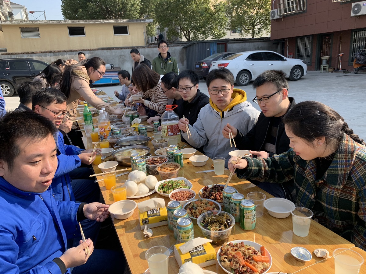 本次活動以宿舍為單位報名參加,以宿舍院落為活動地點,每個宿舍至少準備一個菜品,共同完成一頓豐盛大餐,旨在通過相互協作,增進彼此之間的友誼。早晨7點剛過,就陸續有同事出發去菜市場準備食材,為中午的活動做準備。隨著午餐時間漸近,宿舍樓里熱鬧非凡,鍋鏟碰撞聲、油鍋嗞拉聲、嬉笑聲此起彼伏,大家擼起袖子,使出看家本領,不一會各菜品便相繼亮相,川菜系的毛血旺、酸菜魚、辣子雞丁、醬爆螺螄,黔菜系的宮保雞丁,還有各色小炒:韭黃炒雞蛋、清炒西葫蘆、小炒木須肉等,囊括了五湖四海的味道。新老員工在院落里擺起長桌,如家人般相互招呼入座,明媚的陽光下,大家推杯換盞,品評佳肴,談笑風生,其樂融融!