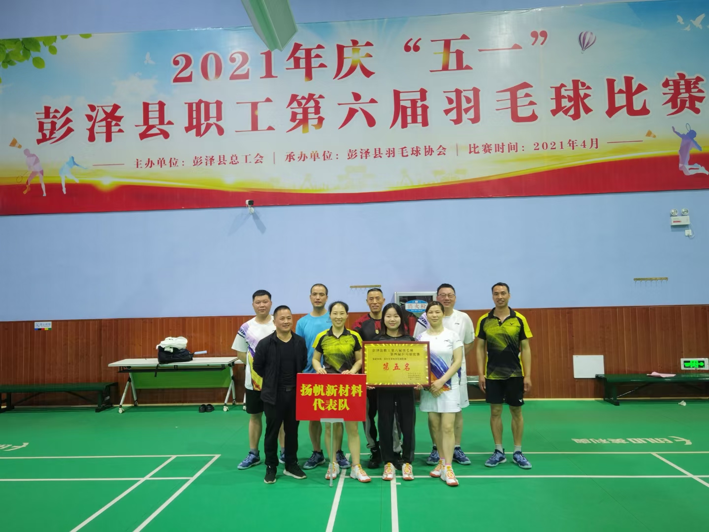 五一前夕,江西揚(yáng)帆新材參加了慶“五一”彭澤縣職工第六屆羽毛球比賽。公司經(jīng)過層層選拔,挑選了9名羽毛球愛好員工組成“揚(yáng)帆新材隊(duì)”,由胡金輝帶隊(duì)全程參與了此次比賽的混、單全部賽次,最終在主力隊(duì)員賽前訓(xùn)練受傷缺席的不利情況下,仍取得第五名的好成績。