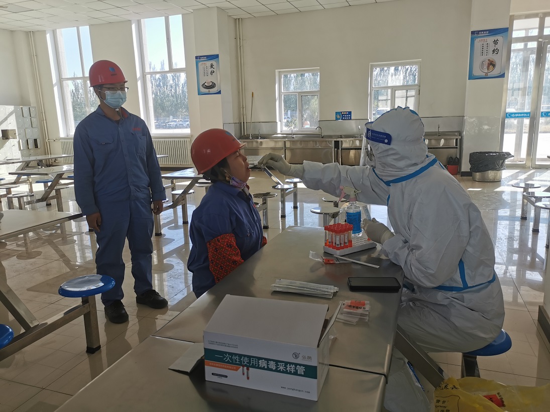 10月8日,根據(jù)阿拉善盟阿拉善高新技術(shù)產(chǎn)業(yè)開發(fā)區(qū)疫情防控部署最新要求,印發(fā)《內(nèi)蒙古揚帆新材料有限公司進一步加強新冠肺炎疫情防控工作要求》;建立疫情防控定期檢查工作機制,定期排查重點返回人員,確保外來人員溯源信息“零疏漏”,緊盯疫情防控重點區(qū)域、重點環(huán)節(jié)等風險點,開展監(jiān)督檢查,確保疫情防控“零死角”;積極配合政府開展核酸檢測工作,10月10日,按照相關(guān)要求,公司聯(lián)系醫(yī)護人員到工廠開展全體職工集中核酸檢測工作,核酸采樣前,做到了提前通知,安排到位。采樣過程中,全體職工自覺遵守防控要求,有序排隊,掃健康碼,10人一組,等候檢測。醫(yī)護人員逐一為職工做咽拭子采樣,相關(guān)工作人員在現(xiàn)場維護秩序,登記、核對信息,整個過程井然有序,采樣流程快速高效,1小時完成全體職工采樣工作。